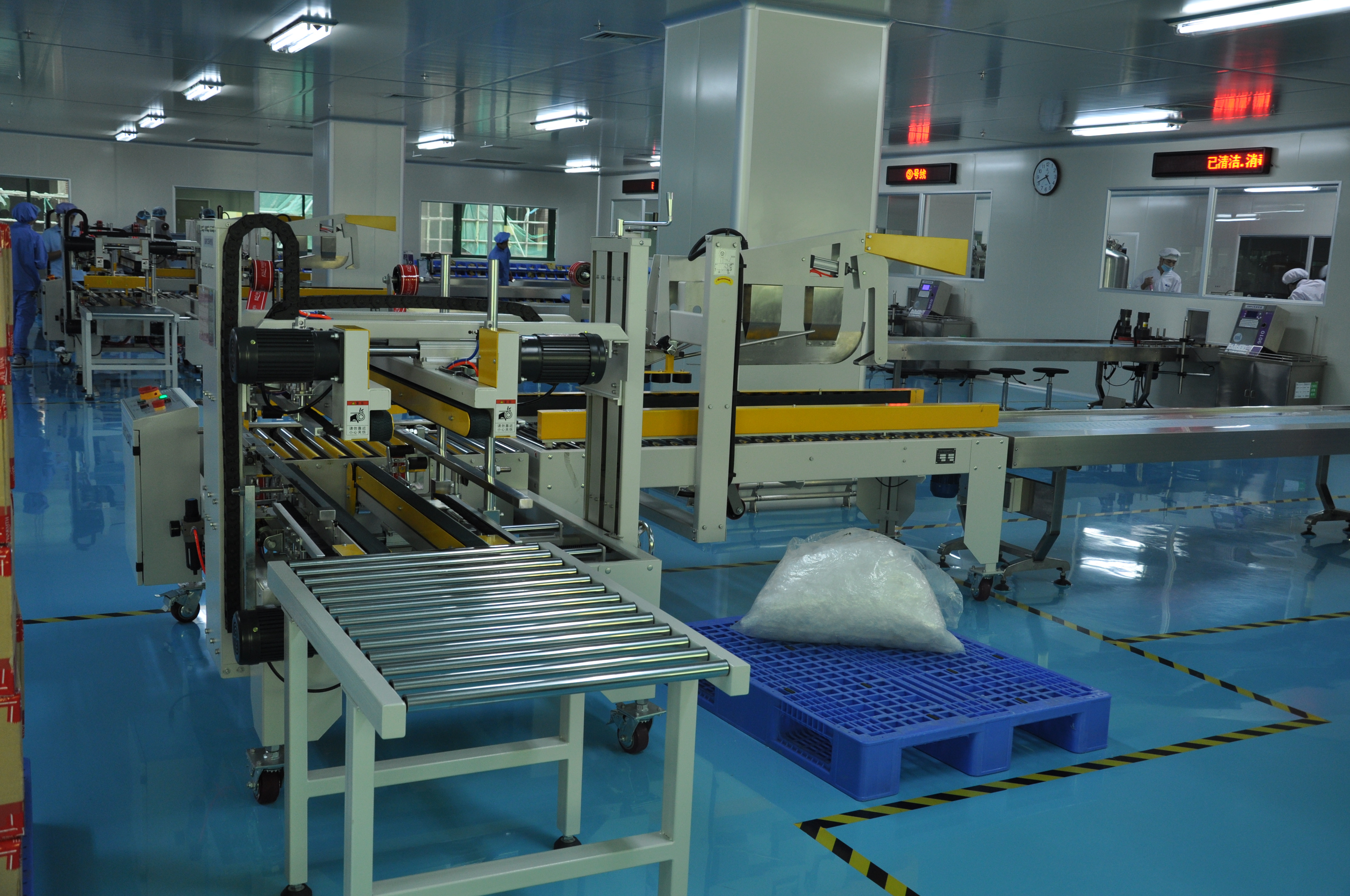 中山日丽化妆品日生产量大,无后段自动化包装流水线,为提升企业形象和生产综合实力,定制一条针对水自动包装设备---全自动角边封箱机流水线。