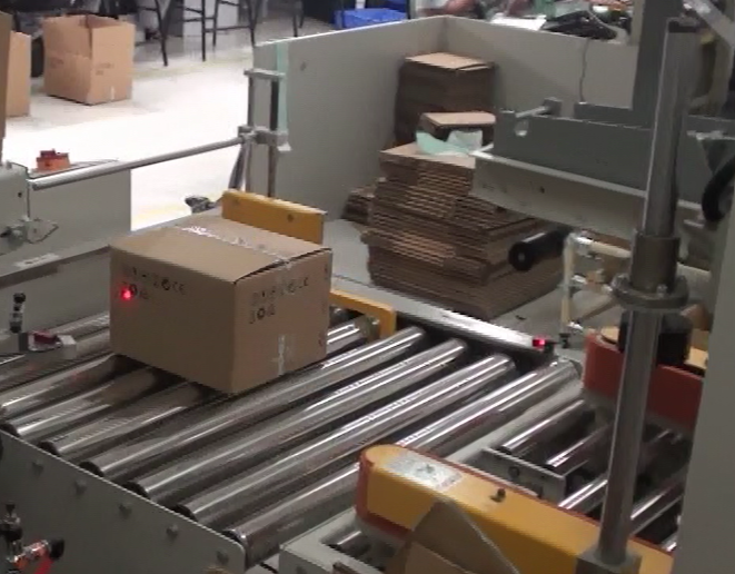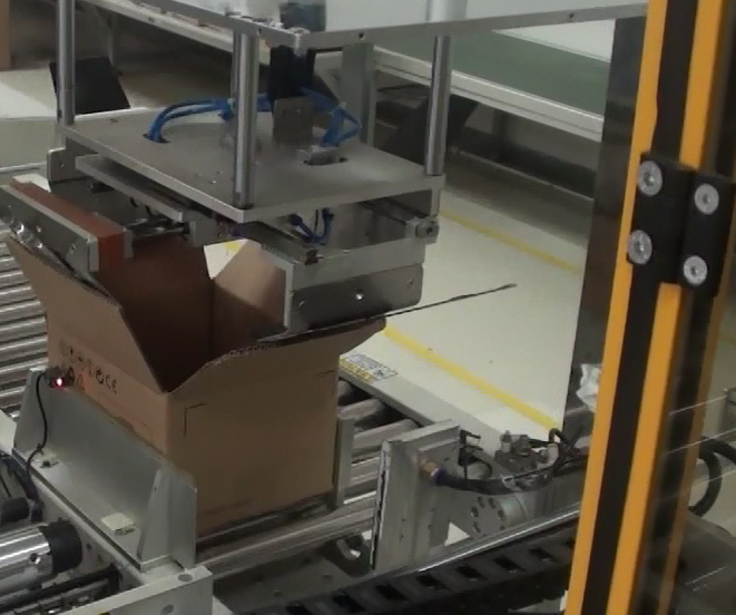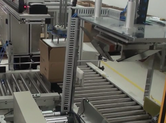 4.流水线组成:整条流水线由自动开箱机——自动贴标机——自动装隔板——物料自动抓取——产品自动装箱——全自动折盖封箱机——全自动四角边封机组成,实现不同的子产品在同一条流水线完成装箱。