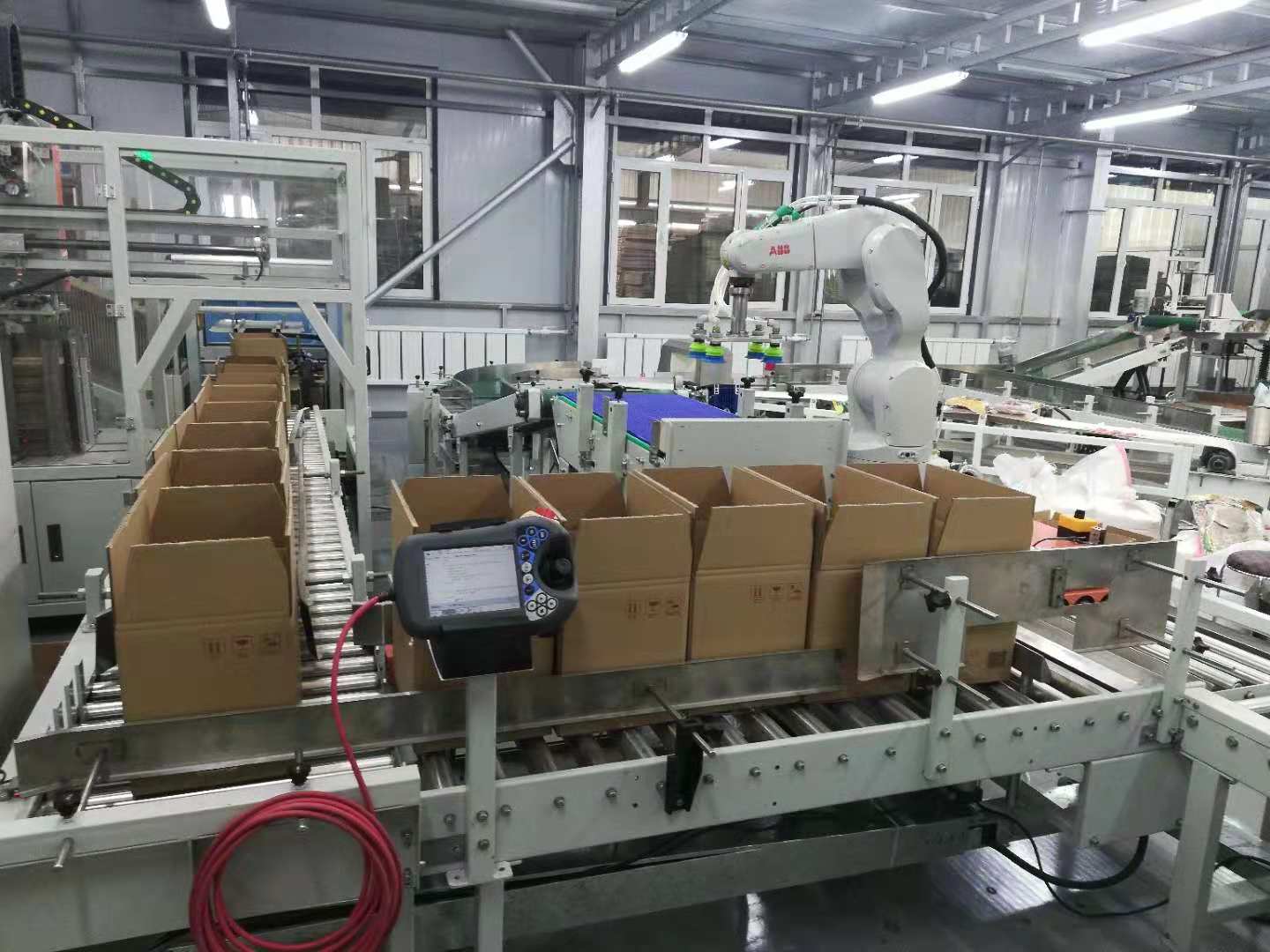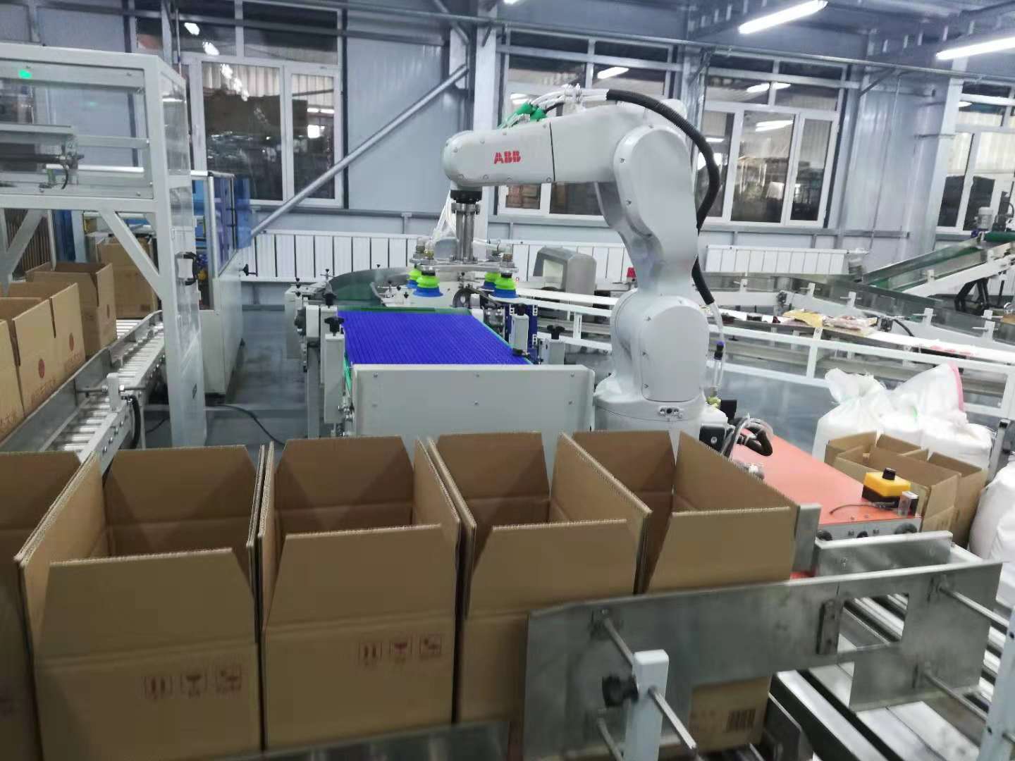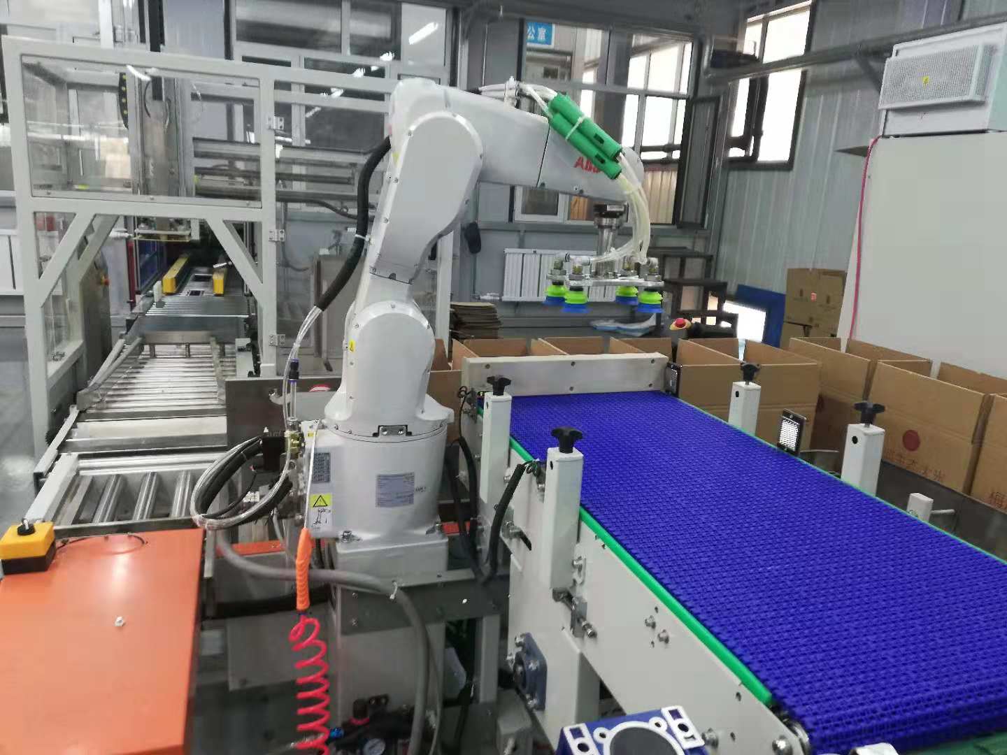 将产品通过进料输送带输送进料,机器人及夹具到产品上方,抓取产品后移动到装箱位,按事先输入的装箱形式进行产品装箱。